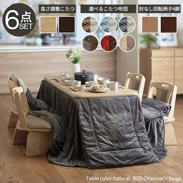 ハイタイプこたつ+専用省スペース布団+肘無回転椅子4脚の6点セット。