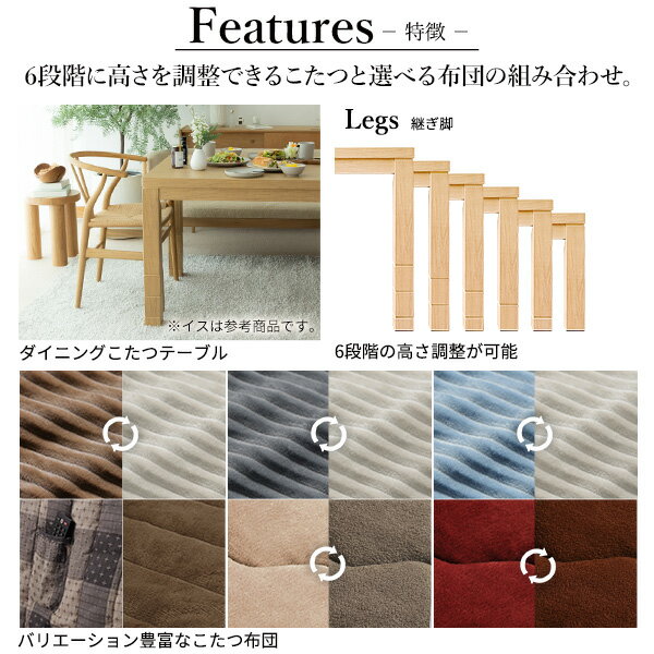 【セット構成】こたつ本体x1台 布団x1枚 【布団バリエーション】しじら織り・レンガxブラウン・ベージュxグレー 【仕様】 天板:繊維板(転写プリント) 脚部:天然木(ラバーウッド) 塗装:ウレタン樹脂塗装 薄型石英管ヒーター(中間スイッチ式) ヒーター消費電力:500W コード長さ:約3m ◎一部組立(脚部取付) ■こたつ布団 [しじら]表地:綿100% 裏地:アクリル100%(ボア) 中綿:ポリエステル100% [レンガ・ベージュ]表地:ポリエステル100%(撥水フランネル) 裏地:ポリエステル100%(フリース) 中綿:ポリエステル100% 【サイズ】 ■こたつ本体 幅135x奥行80x高さ45/50/55/60/65/70cm(継ぎ脚10cmx2個 5cmx1個) 重量:約23kg ■こたつ布団 [しじら] 295x240cm・中綿約1.35kg やぐら面サイズ:133x78cm ポケット:12x16cm コード穴:約10cm [レンガ・ベージュ] 297x242cm・中綿約680g 株式会社ナカムラ広告文責:株式会社ノースウェブ Tel 0144-52-0018代引き不可です。