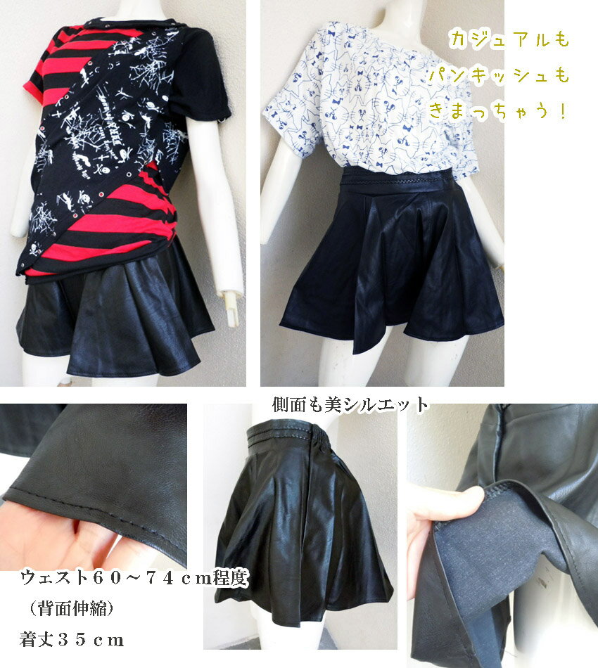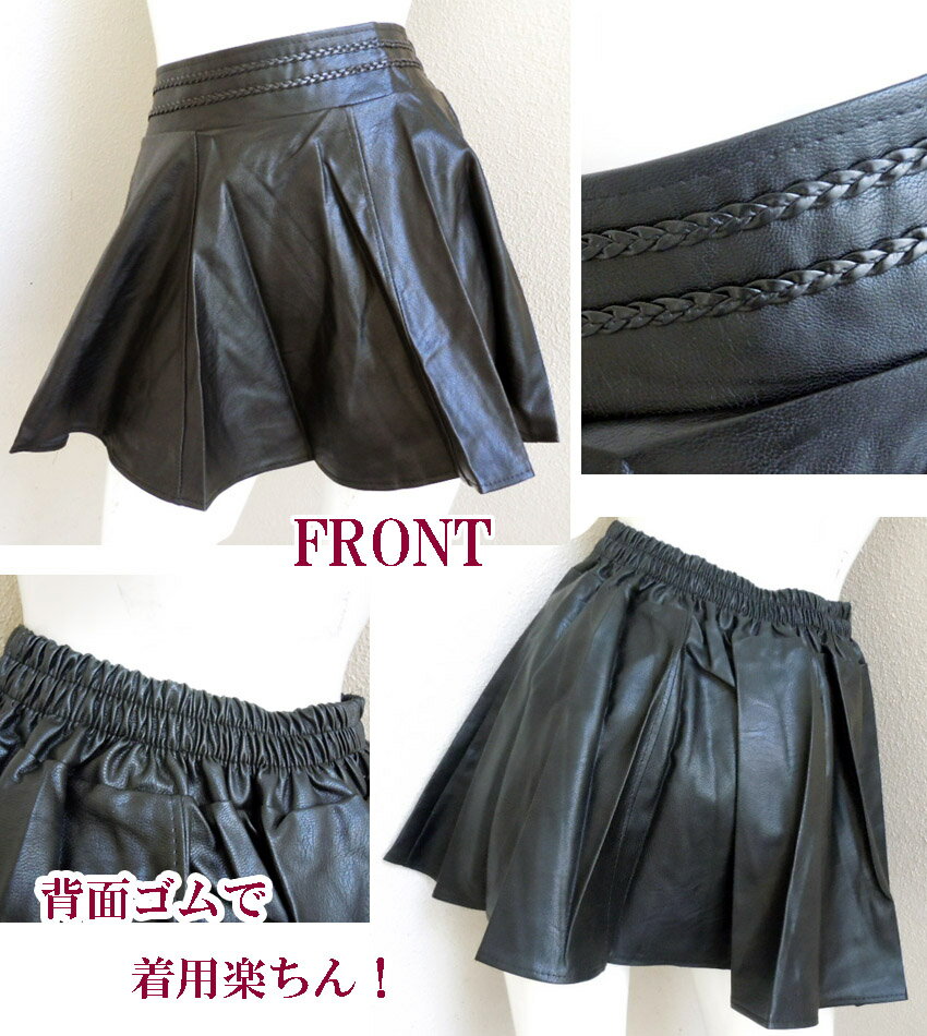 パンクスカート レザースカート ミニスカート フリーサイズ ウェストゴム 合皮 コスプレ ロックテイスト バンド 衣裳 ダンスチーム 編み込みアクセントフェイク