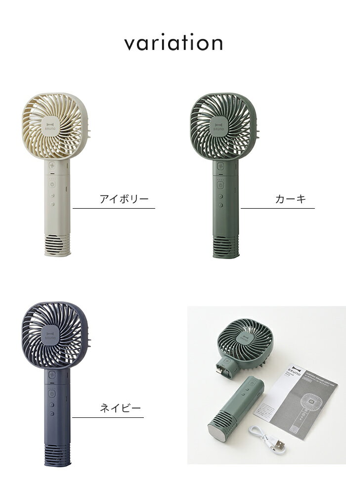 サイズ(約) W105mm×H255mm×D55mm 重量(約) 260g 素材 本体・ガード:ABS樹脂、羽根:ポリプロピレン 電源 リチウムイオン蓄電池 機能 入力:DC5V 2A Max.(USB充電式) 充電時間:約3.5時間(入力 5V 1Aの場合)、連続使用時間:約2.5〜4.5時間 風量3段階切替(弱/中/強)、Bluetooth接続、スピーカー トーチライト、モバイルバッテリー(2,600mAh) 付属品 USBケーブル 注意事項 ※モニターなどの関係により実際の商品の色と多少異なる場合がございます。